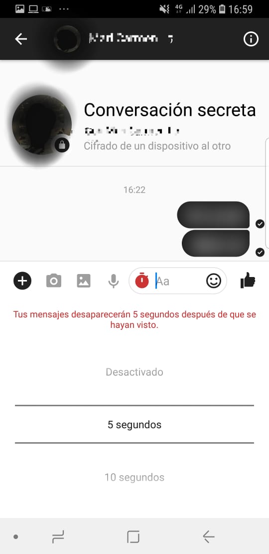 Al abrir este menú, encontrarás una opción que dice "Ir a la conversación secreta" que tiene un icono de candado. Al seleccionarla, podrás enviar mensajes cifrados los cuales podrás elegir si quieres que caduquen o no.