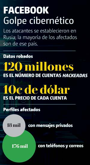 Un grupo de cibercriminales puso a la venta un paquete con los datos personales de 120 millones de cuentas de usuarios de Facebook a un precio de 10 centavos de dólar cada una; estas contienen, entre otra información, mensajes privados de los afectados.