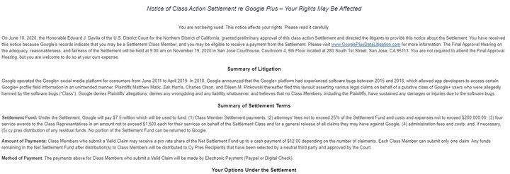 "No estás siendo demandado. Esta notificación afecta tus derechos. Por favor, leela atentamente", dice el mensaje enviado por la cuenta de correo google-noreply@google.com en el que la empresa trata de enmendar una demanda colectiva por parte de millones de usuarios que sufrieron la exposición de datos personales a través de la aplicación Google Plus en el año 2018.