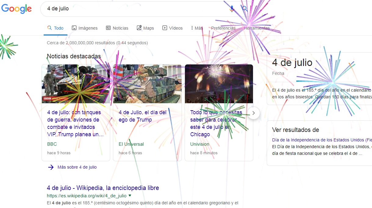Con coloridos fuegos artificiales el gigante tecnológico festeja el Día de la Independencia, sólo es cuestión de que el cibernauta escriba el término “4 de julio” para ver loa lluvia de explosiones pirotécnicas que aparecen en toda la pantalla del ordenador, celular o tablet.
