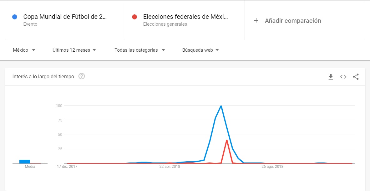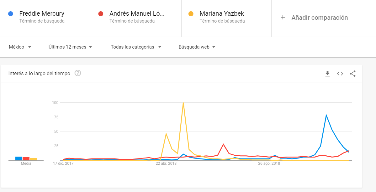 Llama la atención que en México, la política estuvo por debajo del fútbol, pues el término más buscado fue “Mundial 2018”, seguido de “resultados electorales de México” y “Freddie Mecury”. El presidente de México, Andrés Manuel López Obrador se ubicó en cuarto lugar, seguido del popular videojuego Fornite.