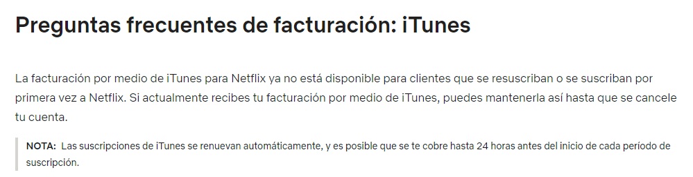 De acuerdo con el sitio oficial de Netflix, el pago a través de la plataforma de Apple ya no será válido a excepción de que mes con mes lo pagues con ese método. Es decir, los nuevos suscriptores tendrán que ir al sitio de Netflix para pagar su plan y en caso de que suspendas el pago de su cuenta y quieras reanudarlo mediante iTunes, tampoco podrás. Necesitarás una tarjeta de débito o crédito o, en su caso, una tarjeta de regalo de Netflix.