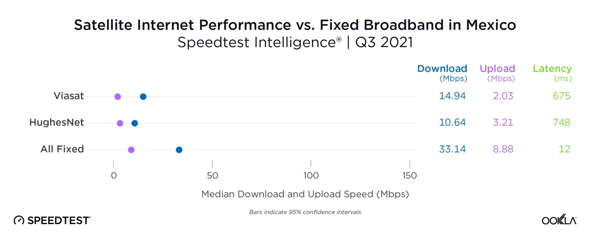 Para nuestro país, Viasat fue el internet satelital más veloz en cuanto a velocidad de descarga, con una media de 14.94 Mbps, por encima de HughesNet, que ofreció 10.64 Mbps. Sin embargo, ambos estuvieron por debajo de la velocidad que la banda ancha ofrece en promedio (de 33.14 Mbps).