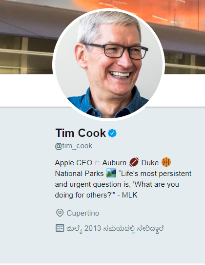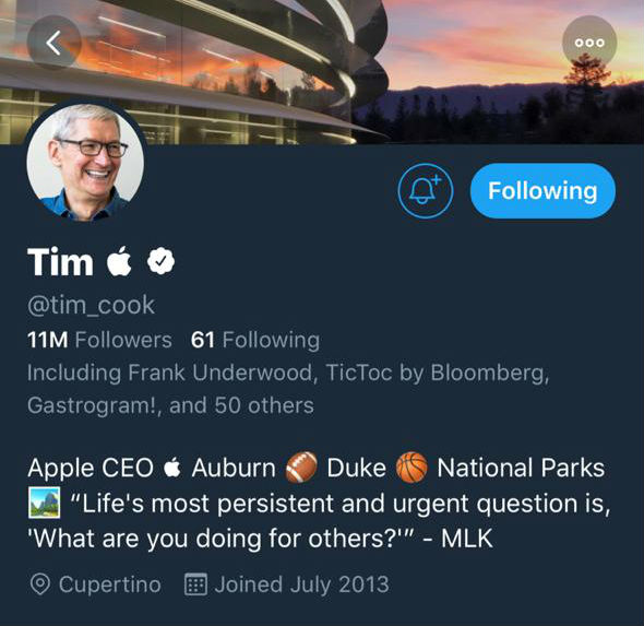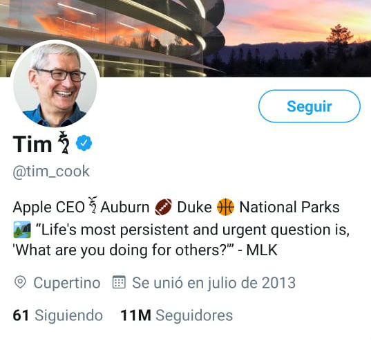 Ahora, en su perfil de Twitter, Tim cambió su apellido Cook por un ícono de una manzanita, clásico de Apple. Pese al cambio, su nombre de usuario permanece como @tim_cook.