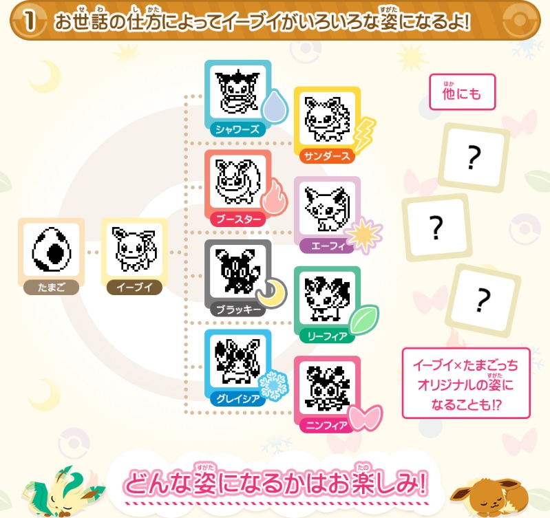 La colaboración entre Tamagotchi y The Pokémon Company permitirá cuidar a un pequeño Eevee, ese tierno pokémon que parece un lindo venado. Pero eso no es todo. Dependiendo de los cuidados que le des, tendrá la posibilidad de evolucionar a una de las ocho pokémon: Espeon, Umbreon, Sylveon, Vaporeon, Flareon, Jolteon, Leafon y Glaceon.