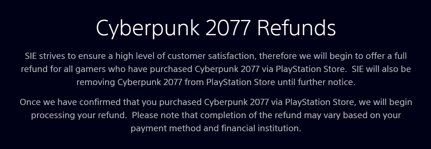 "SIE (Sony Interactive Entertainment) se esfuerza por garantizar un alto nivel de satisfacción de sus clientes y, por consiguiente, vamos a empezar a ofrecer reembolsos" a los jugadores y retirar el juego de la tienda en línea "hasta nuevo aviso", escribió la división de videojuegos de Sony.