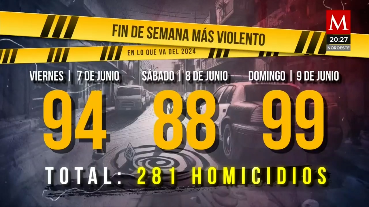 El pasado fin de semana se convirtió en el más violento del 2024 en México, con un total de 281 homicidios dolosos. Las cifras son alarmantes: 94 el viernes, 88 el sábado y 99 el domingo, con Chihuahua, Nuevo León, Guanajuato y Estado de México como -