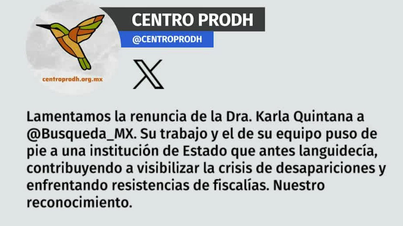 El Centro de Derechos Humanos Miguel Agustín Pro Juárez (Centro Prodh) que acompaña a familias de víctimas de desaparición, lamentó la renuncia de Karla Quintana a la CNB. -