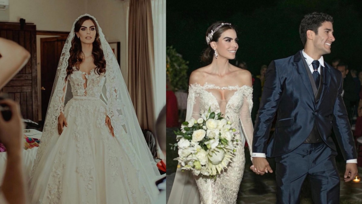 Cynthia de la Vega, además del vestido principal, también puso a la venta otra prenda utilizada durante la ceremonia religiosa, diseñada por Monyk Arreola. -