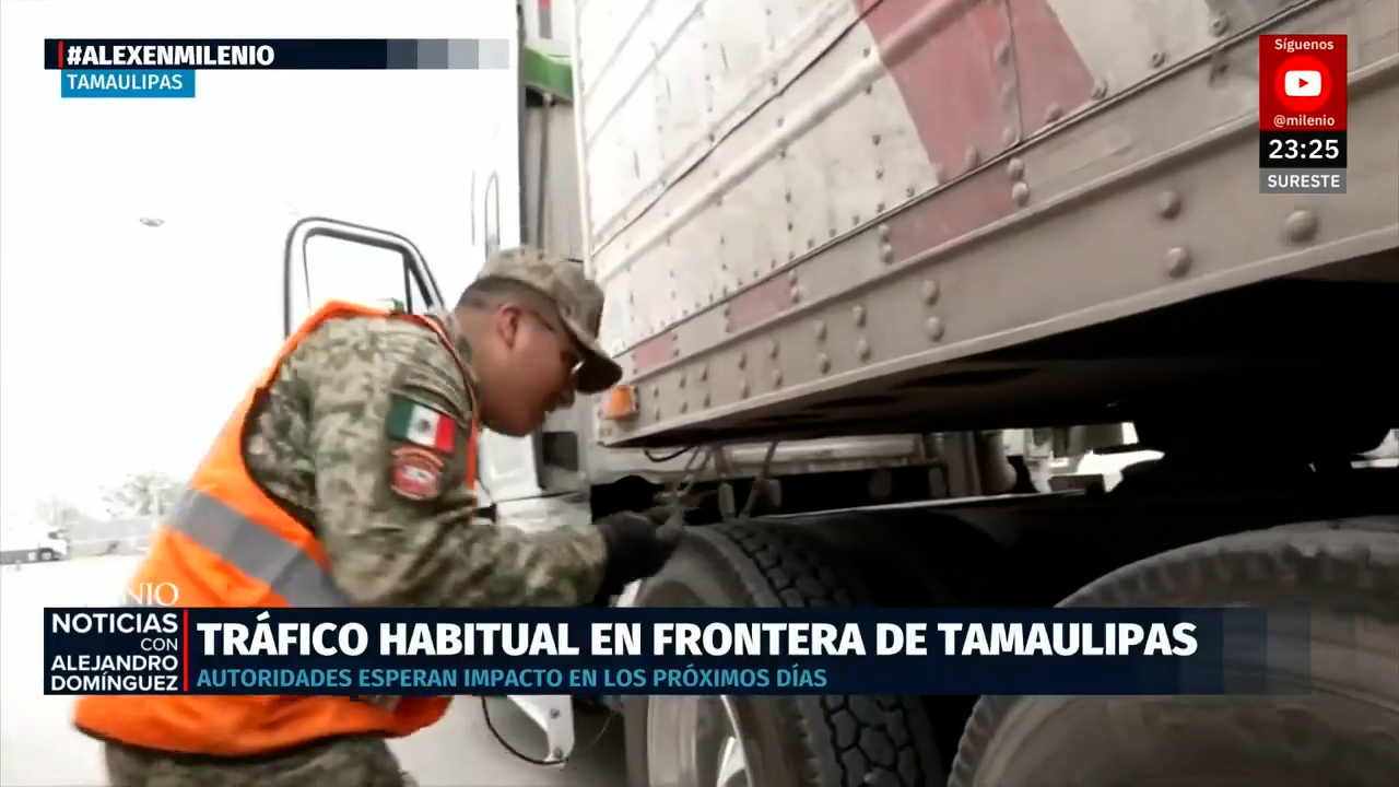 Elementos del ejército y comerciantes en Tamaulipas prevén el impacto de los aranceles impuestos por Trump en la economía fronteriza. -