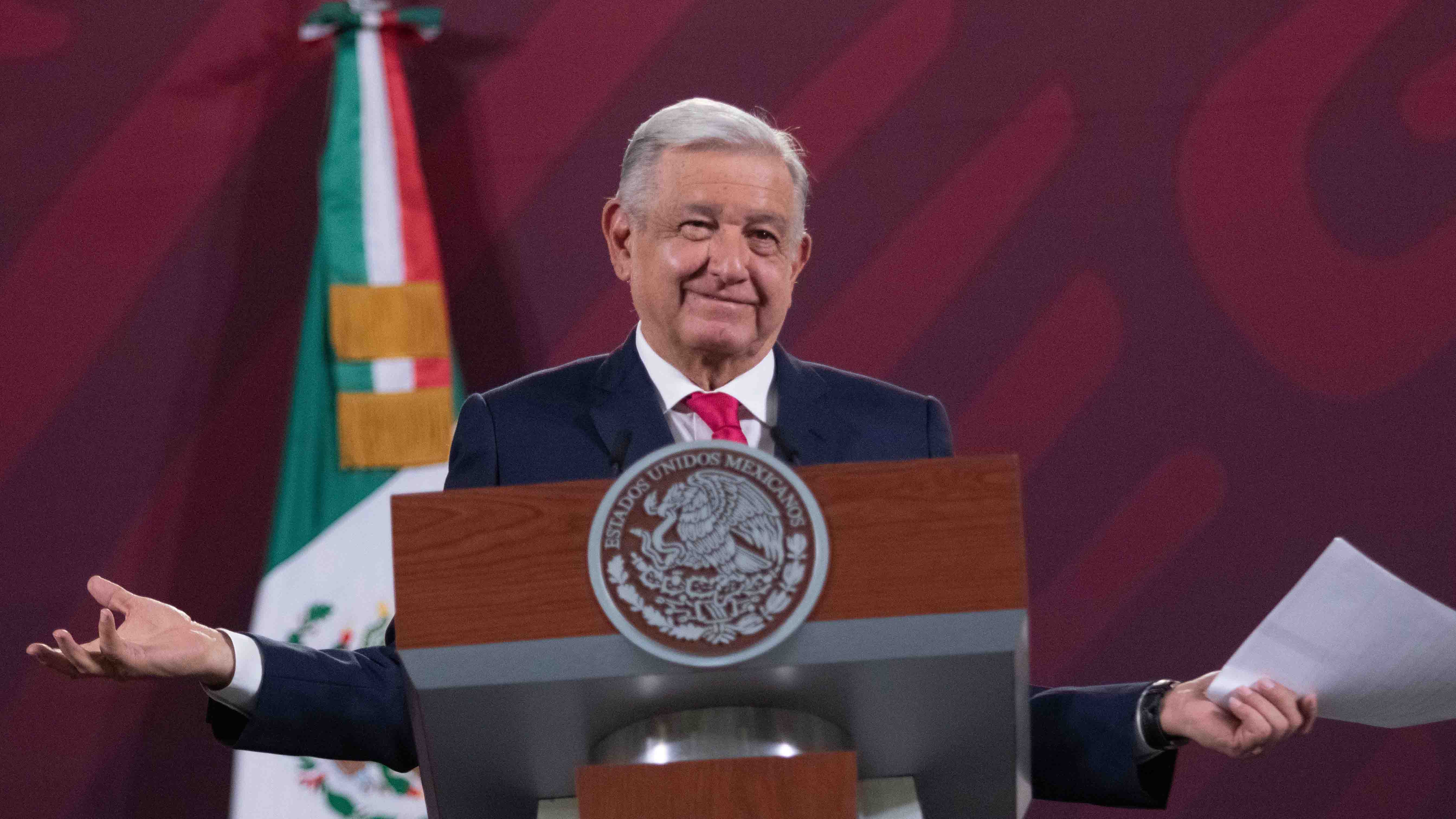 El mandatario pide que expongan en La Mañanera una fotografía de Gabriel Quadri de la Torre recibiendo una tarjeta con Marko Antonio Cortés Mendoza. -