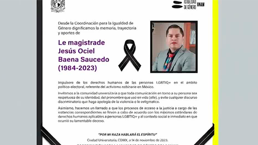 La Coordinación para la Igualdad de Género de la UNAM, destacó la trayectoria y los aportes que le magistrade Ociel Baena hizo. Aseguran que dejó un legado electoral importante para la sociedad y comunidad LGBTQ+. -
