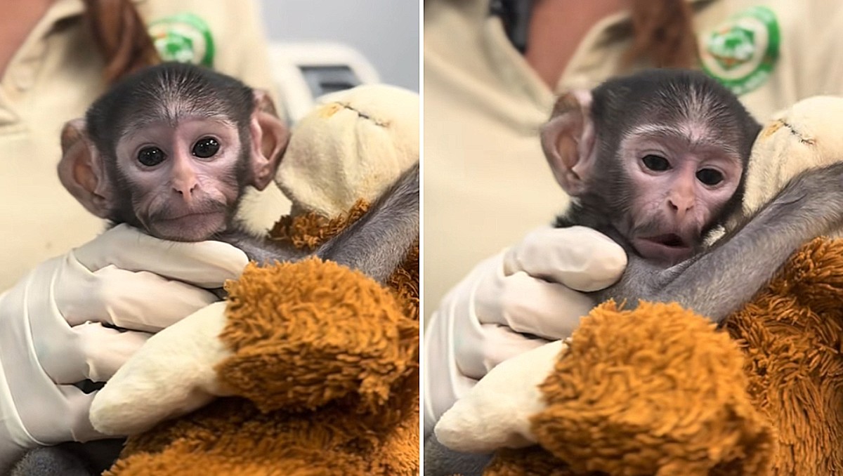 Bajo el cuidado de especialistas, el pequeño primate se aferra a un peluche que sustituye el contacto materno mientras avanza su rehabilitación. -