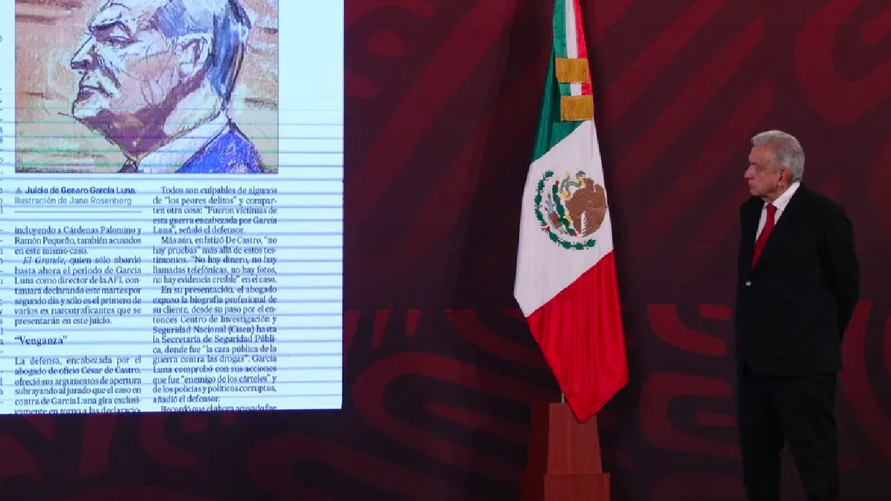 AMLO pide “que no se guarde nada” en juicio de García Luna, muestra spots de narcotraficantes