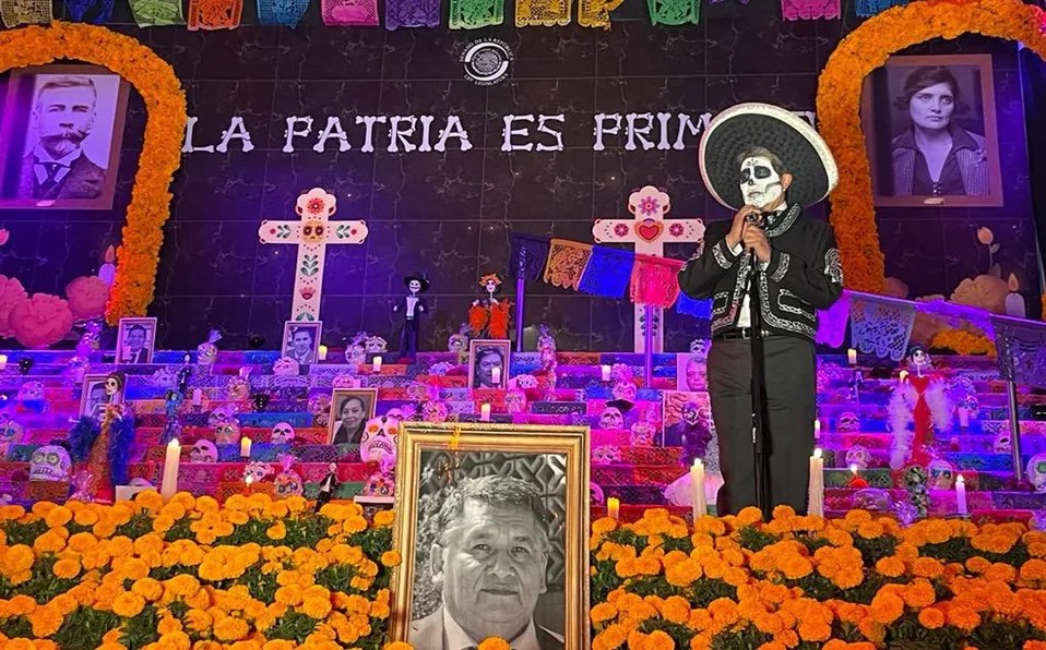 Monreal inaugura ofrenda de Día de Muertos en el Senado, caracterizado de “Charro Negro”