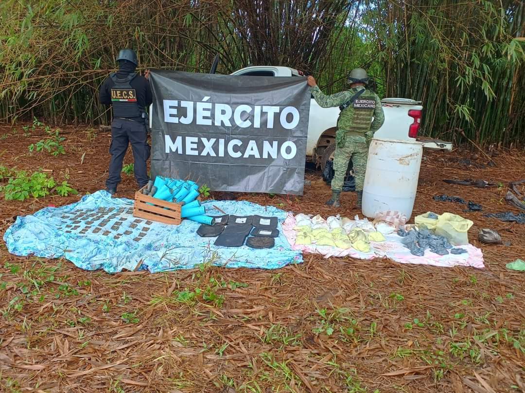 Durante operativos de seguridad, elementos de las fuerzas federales pudieron decomisar autos de lujo, químicos, equipo táctico y explosivo, que ya fue puesto a disposición del Ministerio Público.
