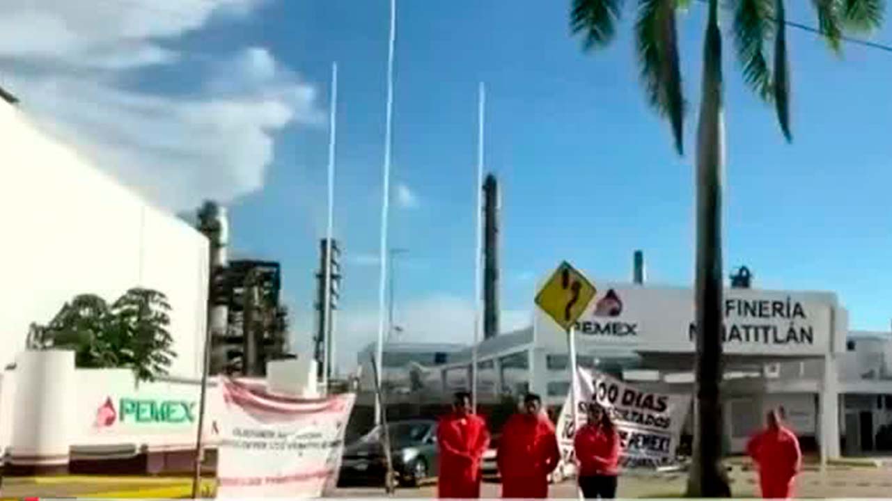 Los trabajadores cumplen más de 100 días de manifestarse por esta causa en la portada Norte de la Refinería de Minatitlán. -