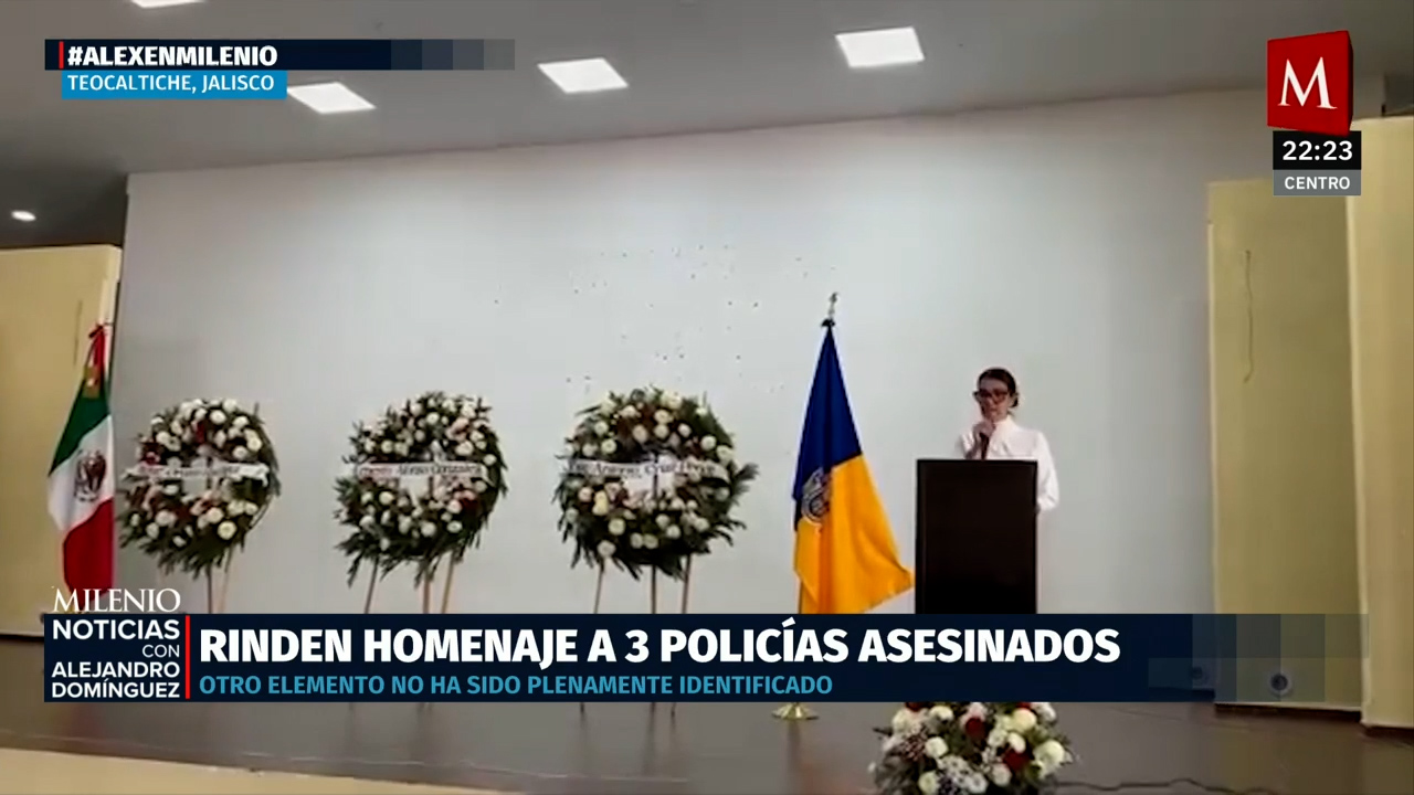 Realizan homenaje póstumo a tres de los cuatro policías asesinados en Teocaltiche, Jalisco, en medio de un fuerte operativo de seguridad.