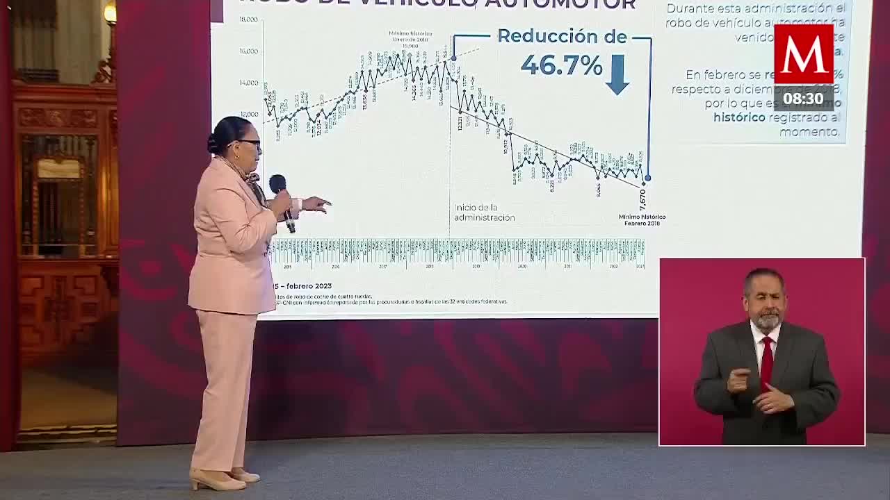Rosa Icela Rodríguez destaca que es un momento histórico para el robo de vehículos, ya que es un delito que presenta reducción en el mes de febrero 2023. -
