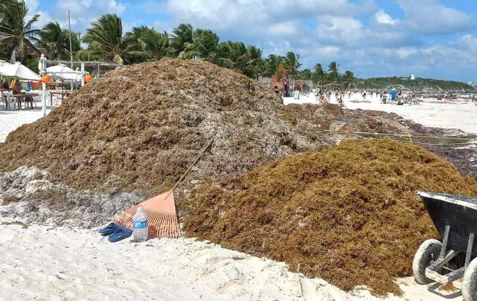 Los recales masivos de sargazo en el Caribe Mexicano se adelantaron dos meses este año y aún que apenas comienza la temporada en algunas playas los recolectores ya no se dan abasto ante los inmensos manchones que el viento y el oleaje acumulan en las -