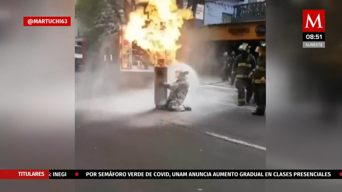 Aunque parece escena de película, ocurrió en la vida real. Un bombero de la Ciudad de México cargó un tanque de gas en llamas para evitar que explotara dentro de un local que reportó la emergencia. -