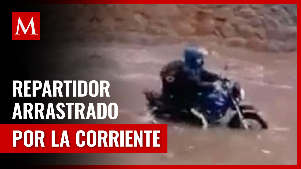 Un momento impactante en la costa de Acapulco: un joven lucha por su fuente de ingresos, su motocicleta, en medio de la tormenta.