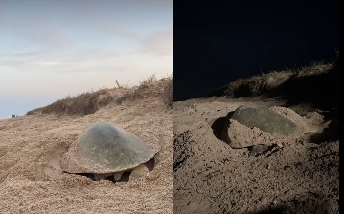 Una tortuga fue captada en video durante la temporada de anidación, mostrando su paciencia para incubar y proteger a sus crías. -