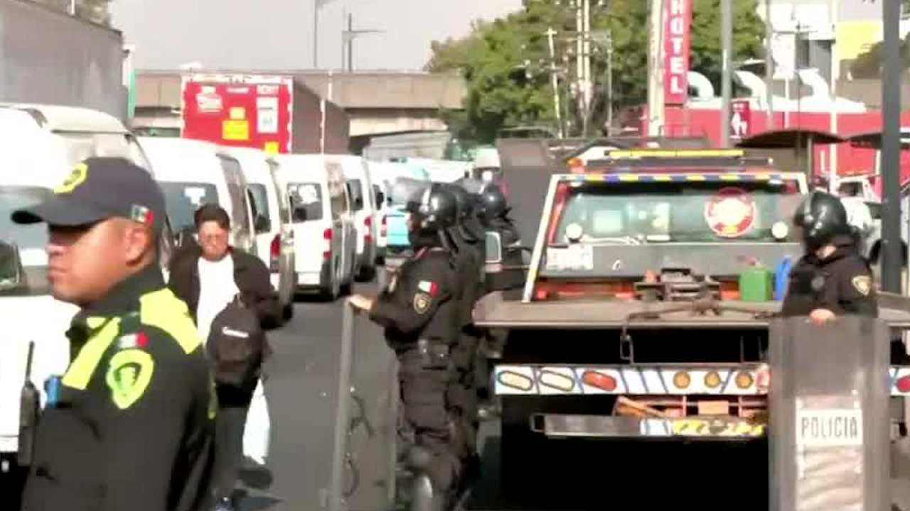 Una concentración de grulleros que iba a avanzar hacia el Zócalo quedó encapsulada por policías. Se ve afectada la circulación en la calzada Ignacio Zaragoza con dirección al aeropuerto. -
