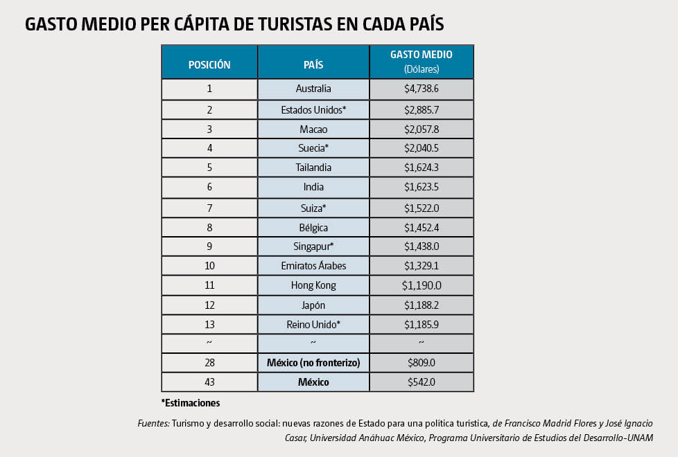 “En parte esta situación obedece, sin duda, al fenómeno del turismo fronterizo. Pero, incluso sin eso, de manera general, los turistas de internación por vía aérea gastan menos de 1,000 dólares por persona en cada viaje, lo que coloca al país en torno al lugar 28 en el mundo”, apunta el reporte de la Universidad Anáhuac y otras instituciones.