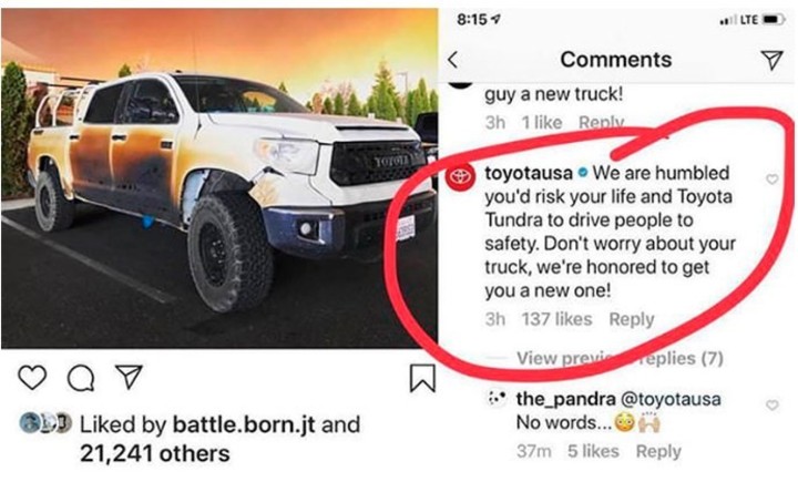 Después de que las fotos empezaron a circular en las redes sociales, la Toyota se enteró del caso de Pierce le prometió una camioneta nueva.