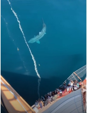 Los secretos que guarda lo profundo del mar siguen sin ser del todo develados, así que es común que la naturaleza siga sorprendiendo con criaturas inimaginables o de impactantes dimensiones. Justo eso le pasó a los pasajeros de un crucero, quienes se toparon de frente con un tiburón enorme, que dejó a más de uno con la boca abierta.