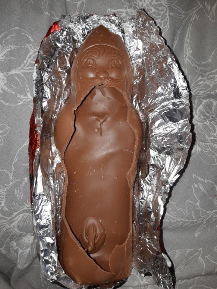 Esto quedó al descubierto tan pronto abrió el chocolate, pues el Papá noel que se encontraba adentro mostraba una parte de su cuerpo que, por seguro, no estamos acostumbrados a ver. Este Santa Claus tenía al descubierto su "pene de chocolate".
