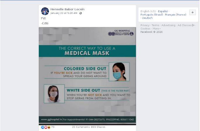 Varias publicaciones explican que las máscaras de protección deben llevarse de forma diferente según la situación: con el lado de color hacia fuera si quien la lleva está infectado por el virus, o con el lado blanco visible si su portador no está enfermo.