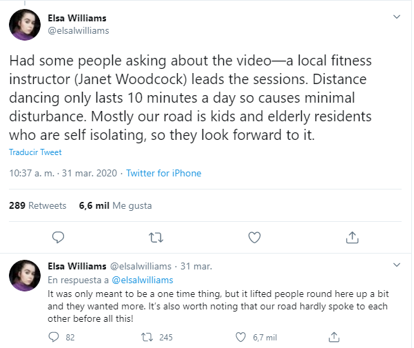 Además de esto, aclaró que el "baile a distancia" sólo dura diez minutos al día, para causar las menores molestias a otros vecinos, y explicó también que éste está principalmente destinado a los niños y los adultos mayores encerrados en sus casas, y que esperan con ansias este momento del día.