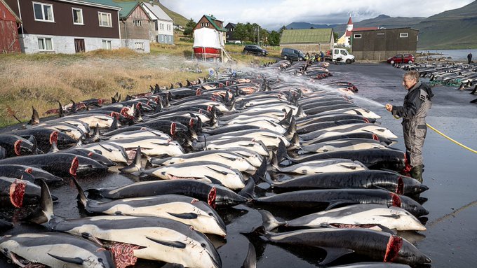 Las fotos en las que se ve a más de mil cetáceos ensangrentados en la playa han generado muchas críticas en redes sociales.