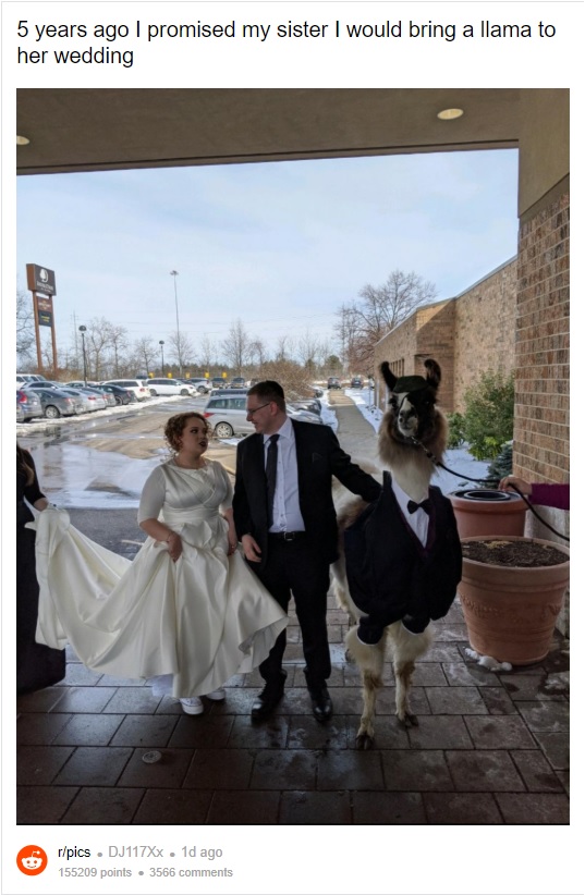 Todo comenzó hace cinco años, cuando Mendl Winstock le prometió a su hermana, Riva, quien hablaba de su boda sin estar saliendo con alguien en ese momento. Para hacerla enojar, le dijo que si lo obligaba a ir a la ceremonia, su acompañante sería una llama.