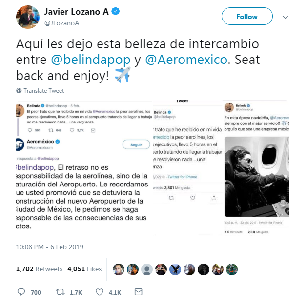 El ex panista Javier Lozano cayó en la trampa y no se salvó del sopetón. Ayer por la noche, compartió Twitterun par de capturas del supuesto intercambio de mensajes entre Belinda y Aeroméxico.