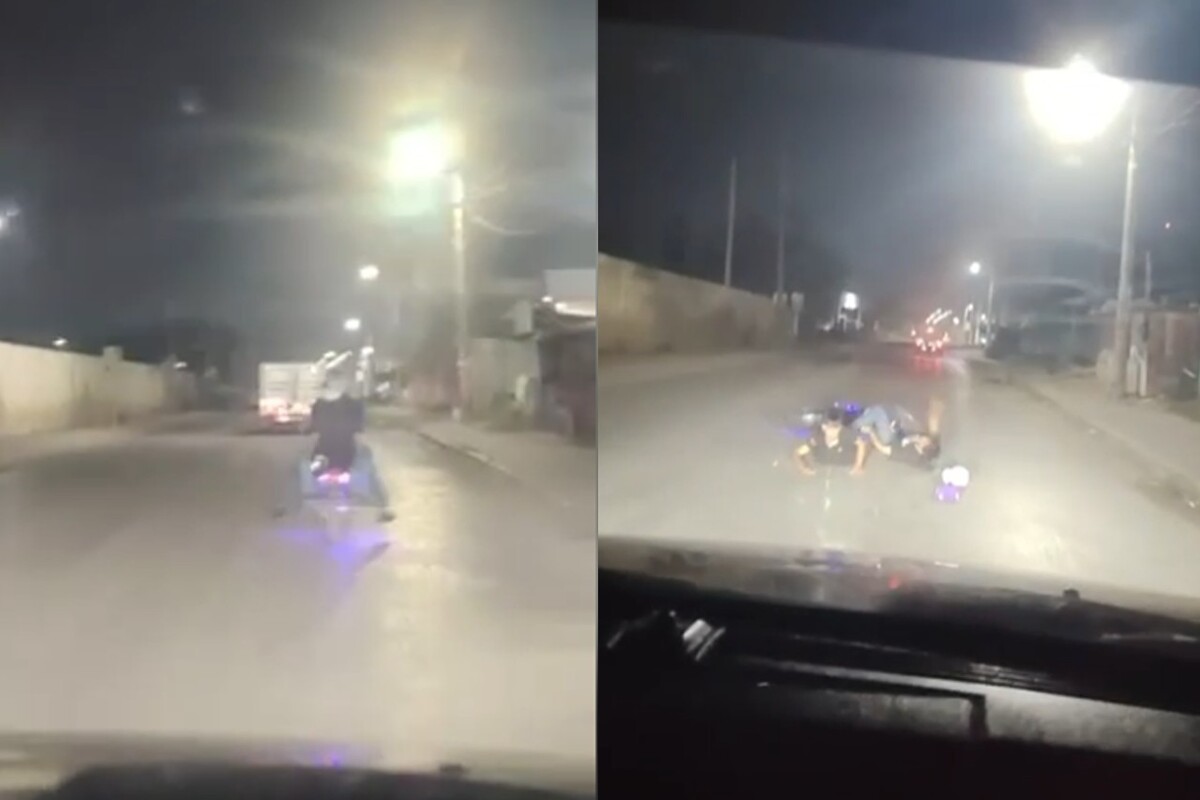 Dos jóvenes realizan "caballito" en motocicleta, y lo que parecía una maniobra de “broma” terminó en segundos de angustia.