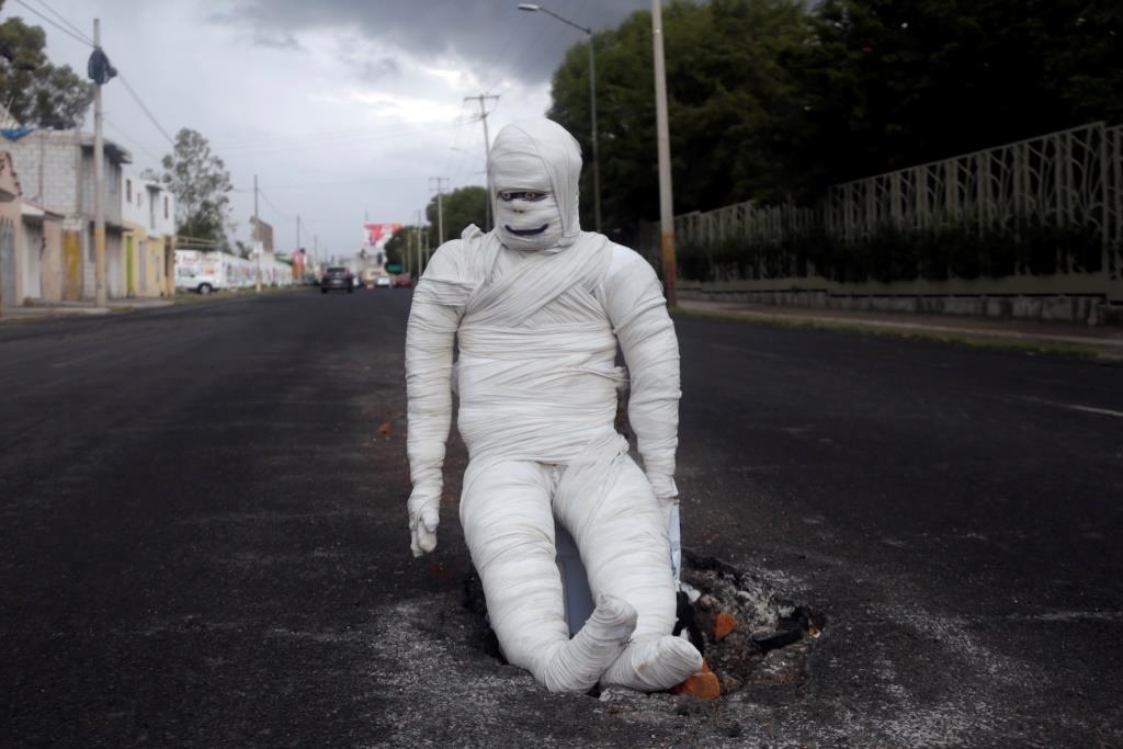 La figura de una momia fue colocada sobre un bache en la ciudad de Puebla, con lo cual advierte a los automovilistas de caer en el agujero que se localiza sobre la calle 26 sur y avenida 9 oriente.