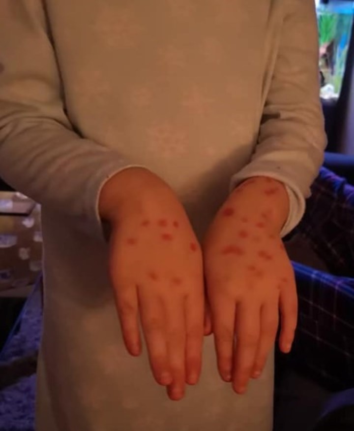 "Tuvimos que enviarla con una carta para decir que las marcas no eran contagiosas o reales y que no podíamos borrarlas. Usamos gel de baño, jabón, agua caliente, aceite de bebé, toallitas con alcohol. Creo que fue la laca para el cabello la que las eliminó después de cuatro días", explicó su mamá.