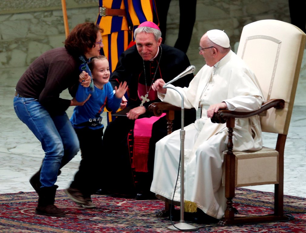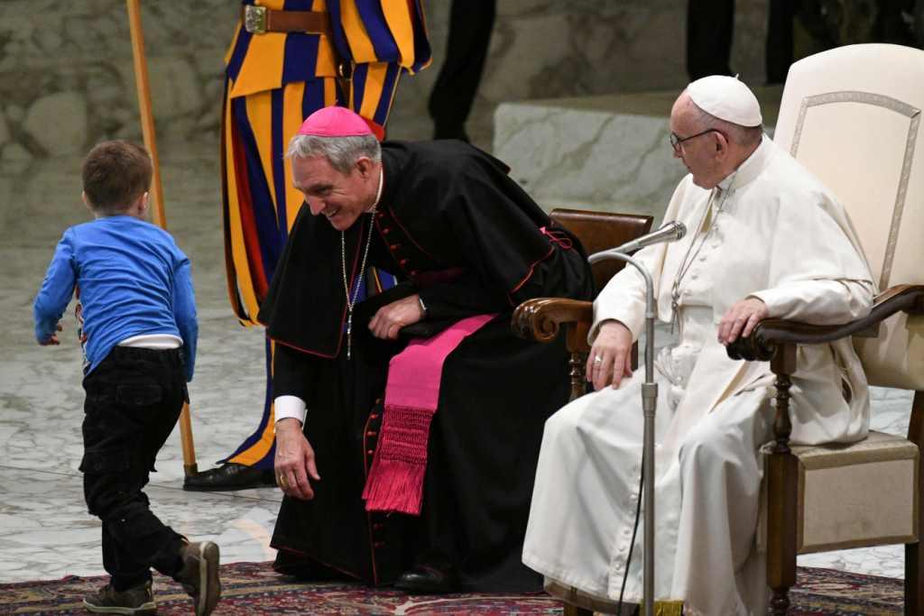 Wenzel Eluney estaba sentado en las primeras filas de la sala, donde se sitúan los enfermos, y en un momento escapó de su madre y subió a la zona donde estaba sentado el pontífice celebrando la audiencia y se puso a jugar alrededor de uno de los guardias suizos y a correr por ese espacio.