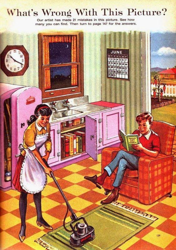 ¿Estás listo? la escena que te mostraremos a continuación, muestra a dos personas, un ama de casa haciendo el aseo de su casa en la época de 1960 y a un muchacho que lee relajado en el sillón, mientras ambos se encuentran en la estancia.