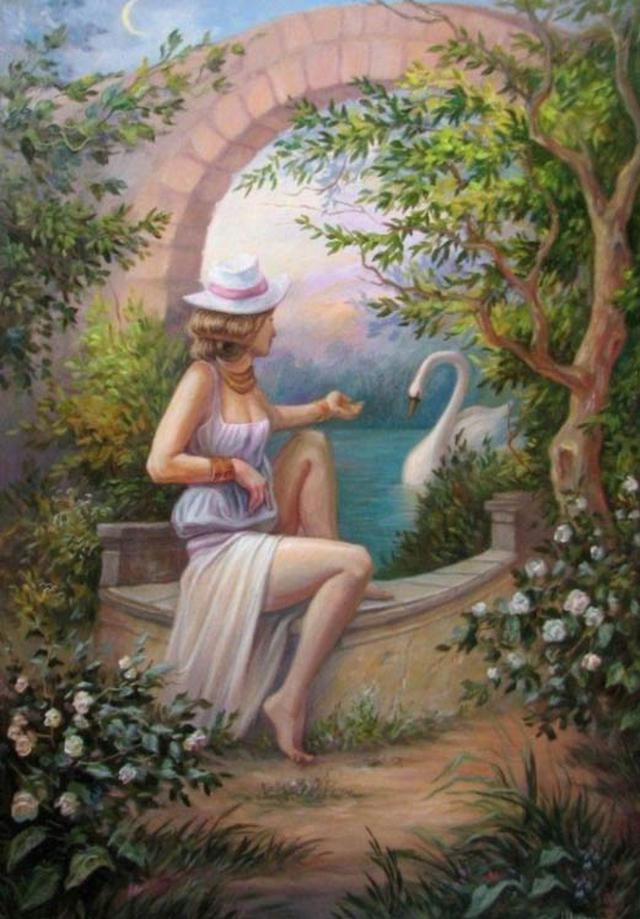 En esta ocasión, te presentaremos una bonita pintura en la que a primera vista puede sólo observarse a una hermosa mujer interactuando con un cisne a la orilla de un lago, sin embargo, aunque la postal pueda ser muy llamativa, y aunque vale la pena observarla, lo que te pediremos es que concentres tu cerebro en observar lo que no salta a la vista, para que nos ayudes a encontrar el rostro oculto dentro de la imagen.