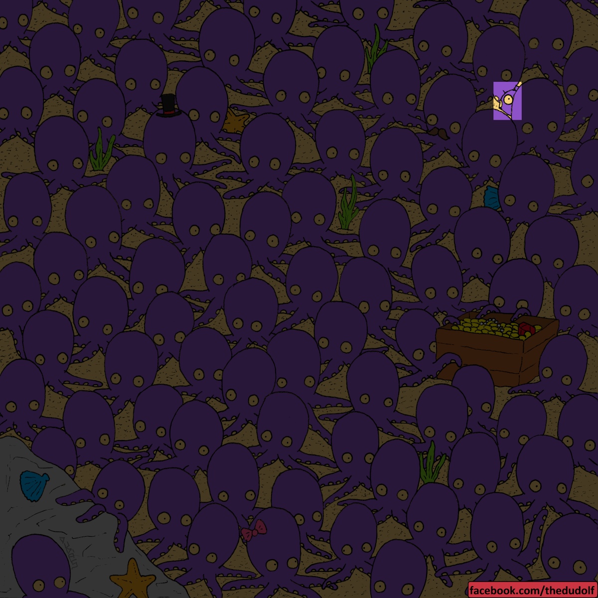 En esta ocasión, tenemos una nueva ilustración del húngaro Dudolf, quien nos muestra un montón de pulpos de color morado; sin embargo, hay un pequeño infiltrado entre ellos: se trata de un pececito que deberás encontrar en tan sólo 15 segundos, y sólo algunos podrán hacerlo. ¿Te atreves a intentarlo? Sigue bajando para ver la imagen.