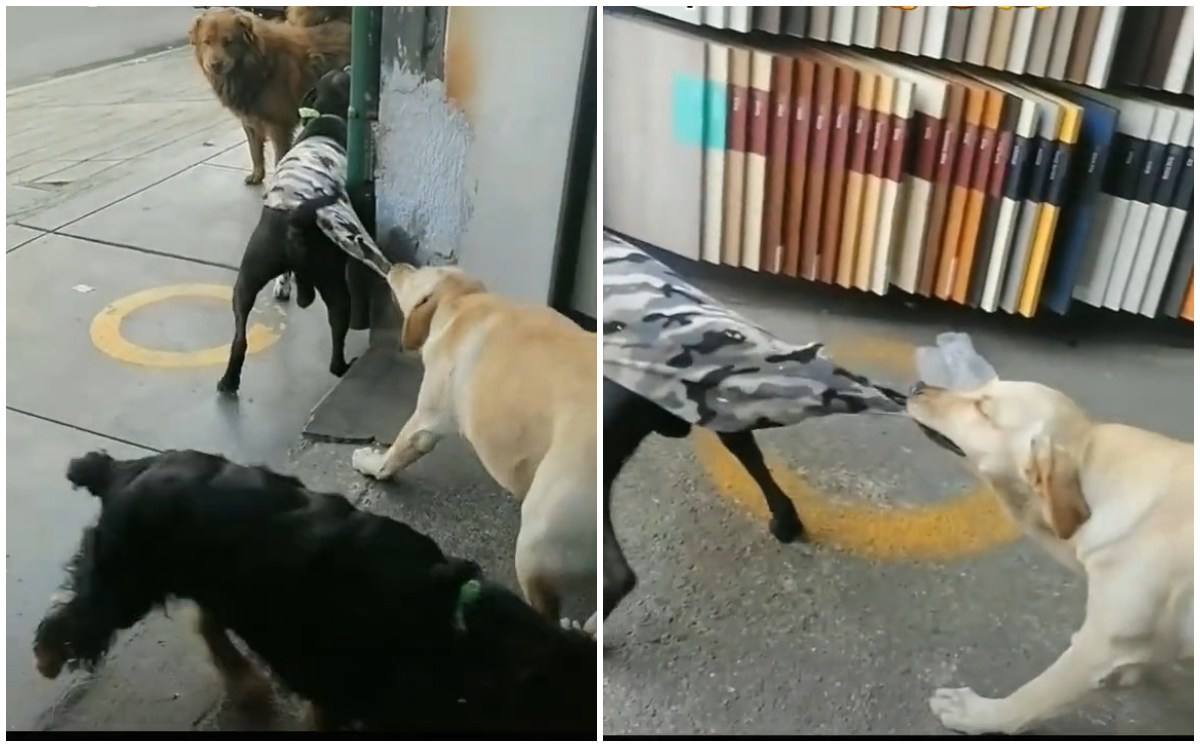 En un video compartido por una cuenta de Tik Tok, se muestra a dos perros muy furiosos el uno con el otro, ladrándose sin parar. Fue ahí cuando un tercer perrito muestra su desesperación y comienza a jalar del chaleco de camuflaje que tenía el implicado en la pelea, para atrás con el fin de evitar una pelea.