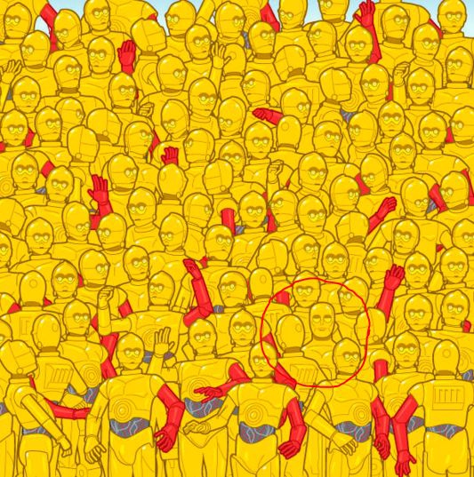 A continuación, te dejamos una imagen que en su mayoría tiene C-3PO, uno de los personajes más queridos por los fans de Star Wars, pero entre ellos está una estatuilla de los Premios Oscar ¿Puedes encontrarla?