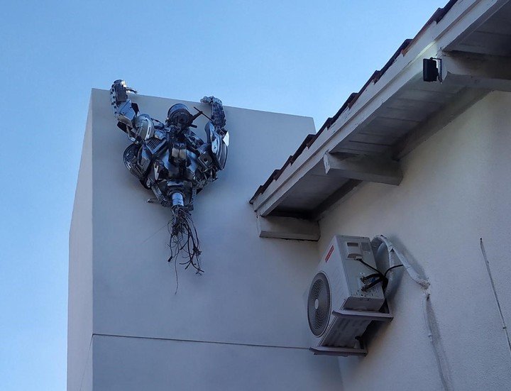 Sin embargo, el que más llama la atención en el vecindario es el robot que cuelga del techo, del cual se alcanzan a ver los circuitos brotar de su interior, dicha escultura es un tributo al androide T-800 de la exitosa cinta Terminator. Cabe mencionar que estos Transformers llegan a medir hasta dos metros de alto.