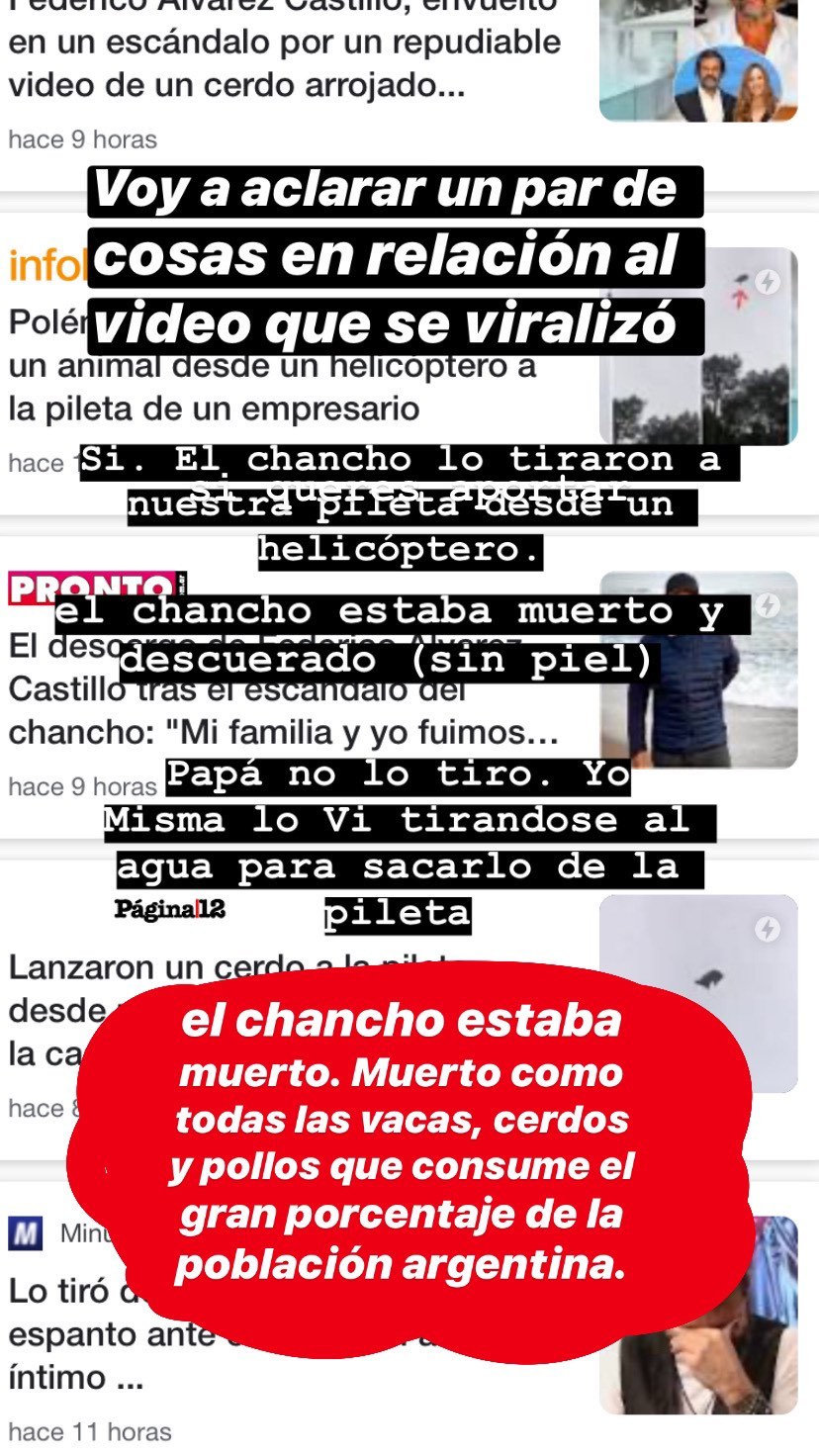 De acuerdo con el testimonio del empresario de moda Federico Álvarez Castillo, se dio cuenta de lo sucedido al escuchar un fuerte ruido en el jardín. Salió junto a su esposa para ver qué sucedía: había un cordero muerto en la piscina.
